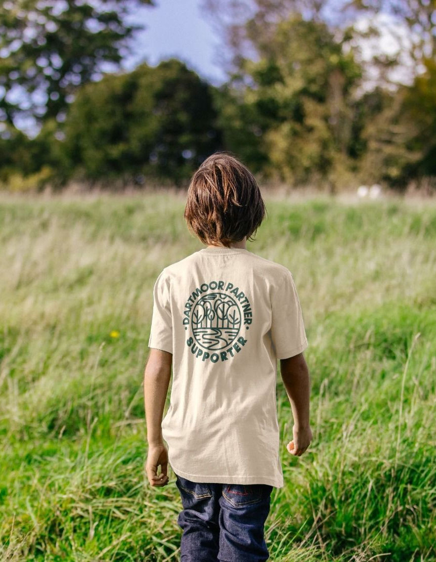 This kid's Dartmoor t-shirt is made from Organic Cotton, Oat, Mustard, Soft Lilac, Mauve, Sage, White with Dark Green print 'Dartmoor Partner' logo.